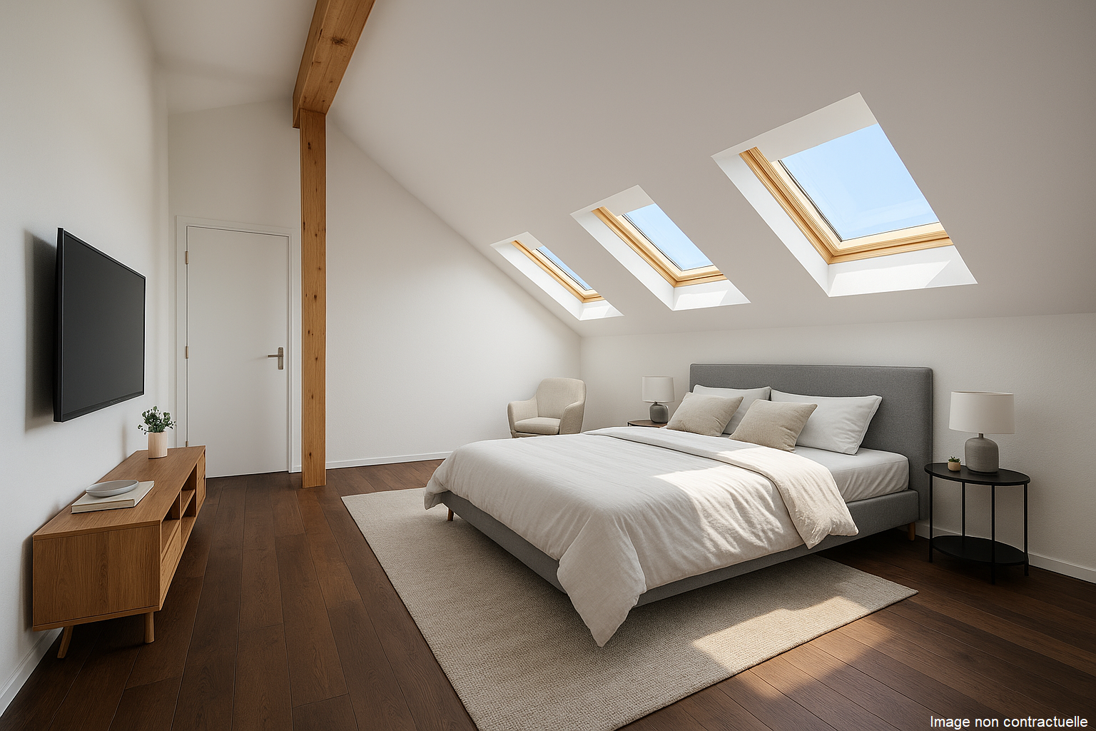 Deux chambres supplémentaires accueillantes, une salle de bains/WC moderne, de nombreux rangements sous combles et un local technique privé (colonne de lavage intégrée/garde-manger) complètent ce bien.