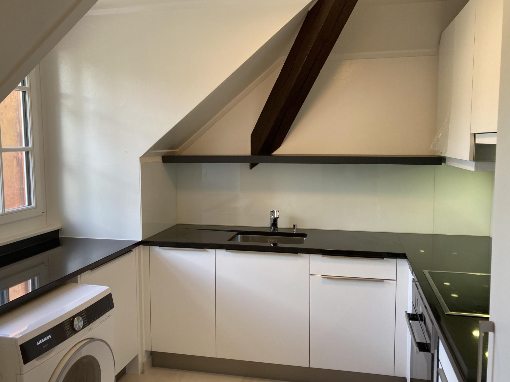 - cuisine agencée fermée avec un lave-linge et armoire à balais