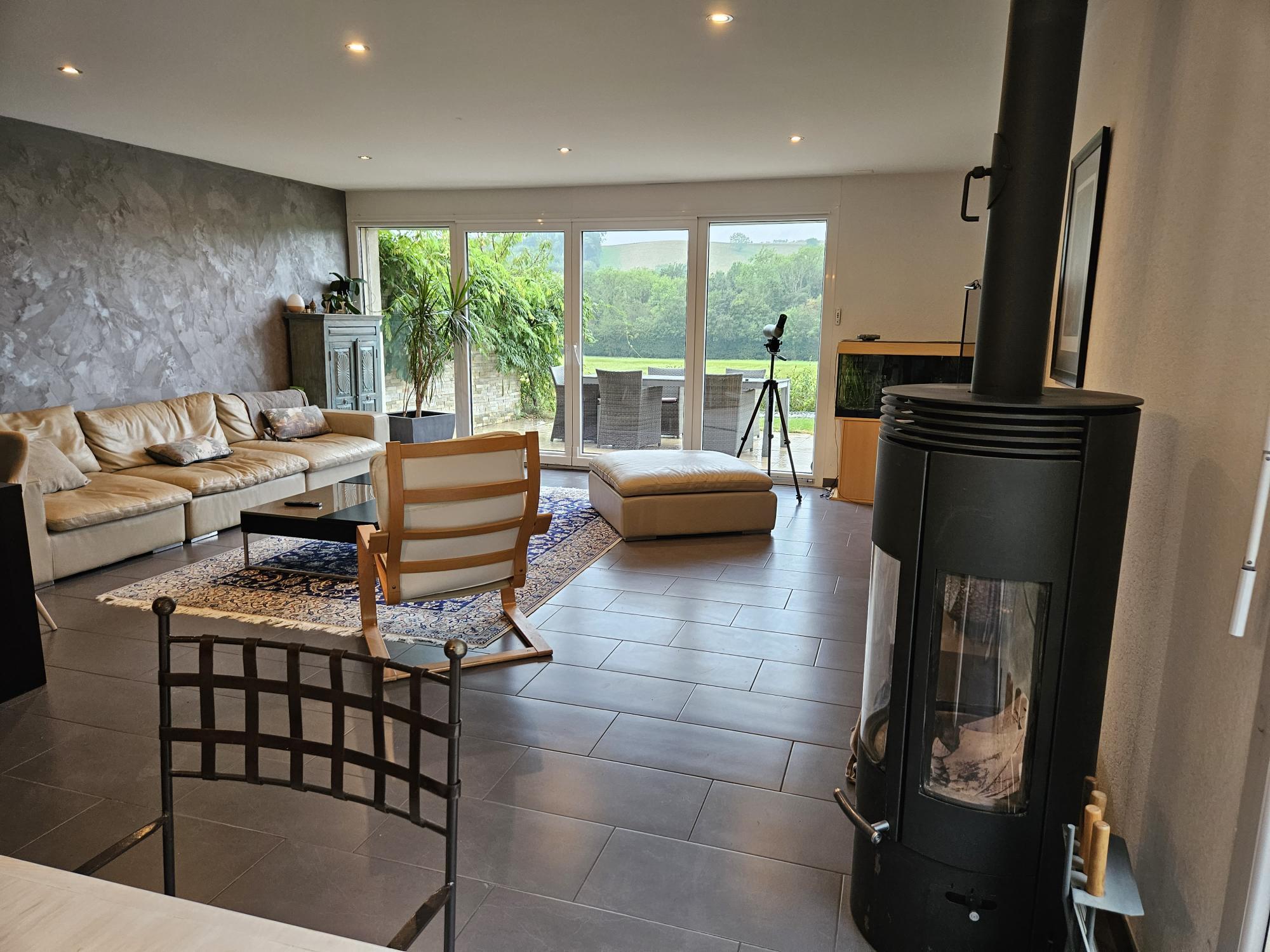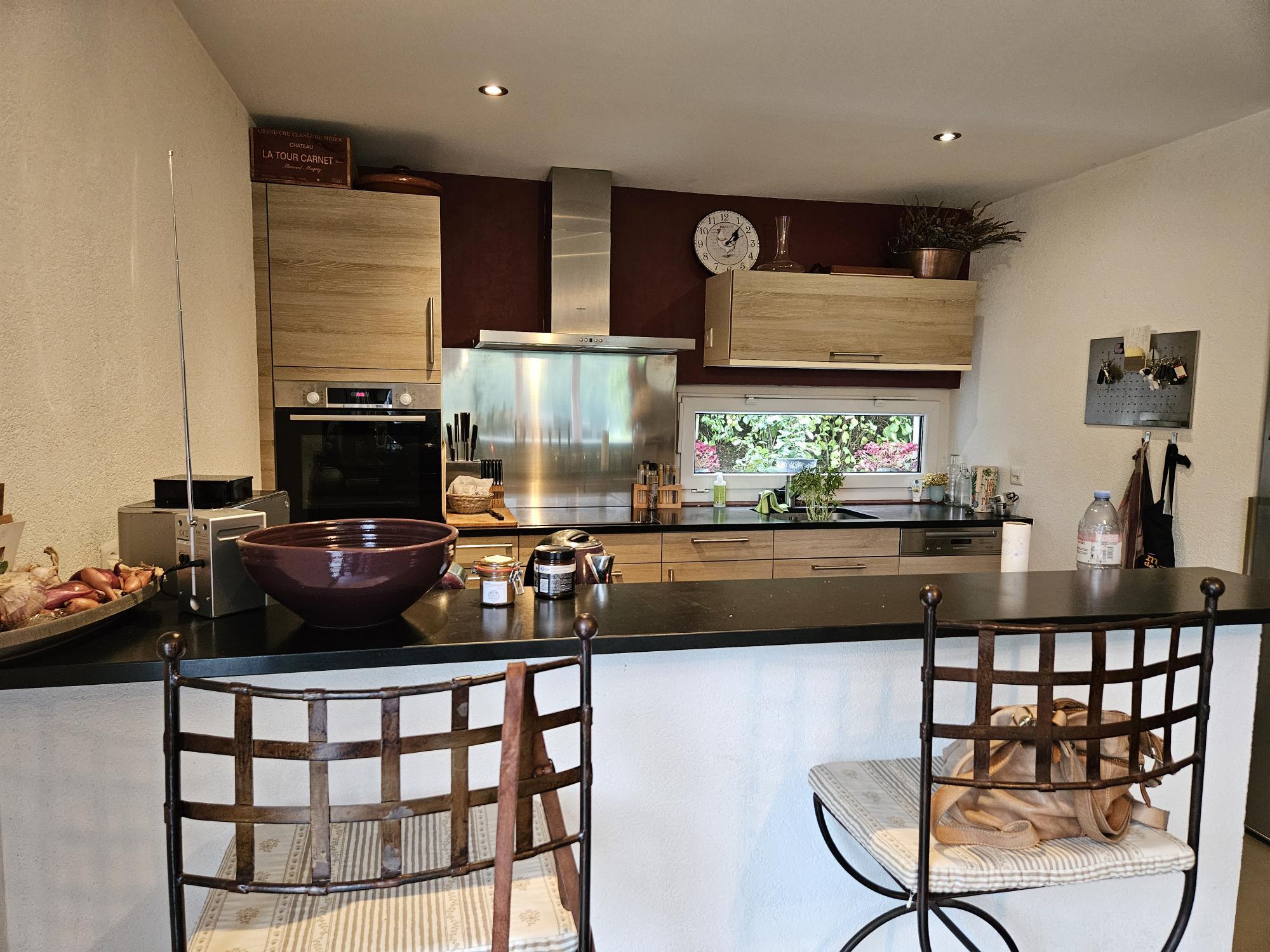 Entrée-dressing, belle cuisine agencée ouverte sur salle-à-manger/séjour avec poêle et avec accès jardin, wc visiteurs